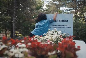 Яман коленичи, погалва камъка с трепереща ръка, сякаш иска да докосне нея. Вади старите, увехнали цветя, смачкани от времето и сълзите му, и ги заменя с новите – свежи, бели, невинни, като самата нея.