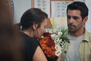 И тогава, сякаш сцената се разгръща на забавен каданс, във фоайето влиза млада жена. В ръцете ѝ, букет свежи цветя, а усмивката ѝ е топла, почти сияеща, докато се приближава до бюрото на Али.