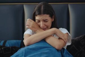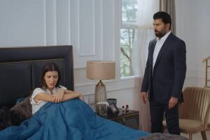 Хира седи на леглото и плаче тихо, свита на леглото. Орхун влиза и се приближава до нея. Хира не чува влизането на Орхун.