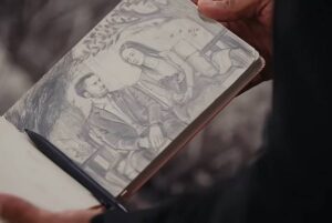 На една от страниците е нарисуван моментът, в който двамата гледат филм на прожекционния екран. Усмивка се появява на лицето му.