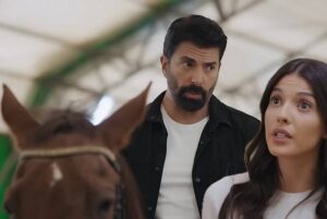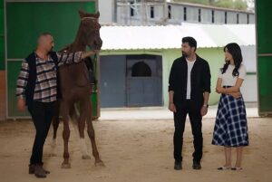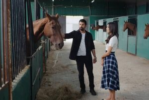 Хира и Орхун стоят до един от конете, благородно животно с тъмна грива и дълбоки очи. Орхун леко прокарва ръка по шията му, а движенията му са уверени, спокойни.