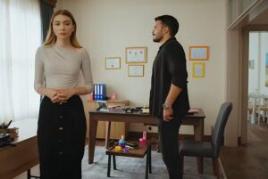 Докато продължава разговора, на вратата се чука. Тя се открехва леко и се появява Хира, с тефтер, но без онази увереност от по-рано. Орхун само я поглежда, но веднага прекратява разговора.