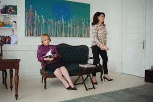 Тя се обръща и тръгва към вратата. В мига, в който гръбът ѝ е обърнат към Афифе, лицето ѝ се променя, добродушната маска изчезва, заменена от лека, самодоволна ирония и излиза от стаята в добро настроение.