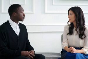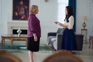 Нуршах замръзва. Очите ѝ първо търсят тези на Кенан, сякаш за помощ. Той я гледа, без да трепне, с израз, който ѝ дава сила. Тя преглъща, поема дъх и се обръща към Нефес с мек, но решителен глас.